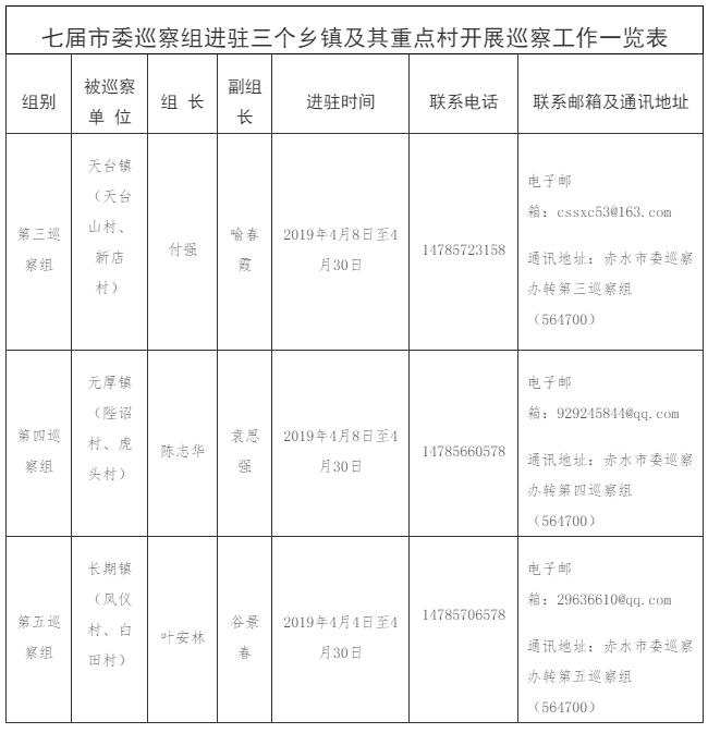 本轮巡察将坚持以习近平新时代中国特色社会主义思想为指导,坚守政治巡察职能定位,认真贯彻中央巡视工作方针和巡察工作要求,强化党的政治建设,以“四个意识”“两个维护”为政治标尺,重点围绕学习贯彻党的十九大精神、习近平总书记重要指示精神以及中央、省委、遵义市委和赤水市市委关于脱贫攻坚和机构改革方面的重大决策部署,深入了解和查找被巡察党组织和党员领导干部在全面遵循党章、坚持党的领导、加强党的建设和落实党的路线方针政策方面情况,履行全面从严治党责任、遵守党的纪律、执行中央八项规定精神和省委相关规定、党风廉政建设和反腐败工作以及选人用人、落实意识形态工作责任制、贯彻脱贫攻坚和机构改革决策部署、抓实“扫黑除恶”工作、落实省委巡视反馈整改工作等方面的情况和问题。 巡察期间,市委各巡察组设置并公布了联系电话、电子邮箱和邮政信箱,受理反映被巡察单位党组织领导班子及其成员、其他市管干部、下一级党组织领导班子主要负责人及其他重要岗位干部问题的来信来电来访,重点是关于违反“六大纪律”等方面的举报和反映。对不属于巡察受理范围的信访问题按规定转有关部门认真处理。