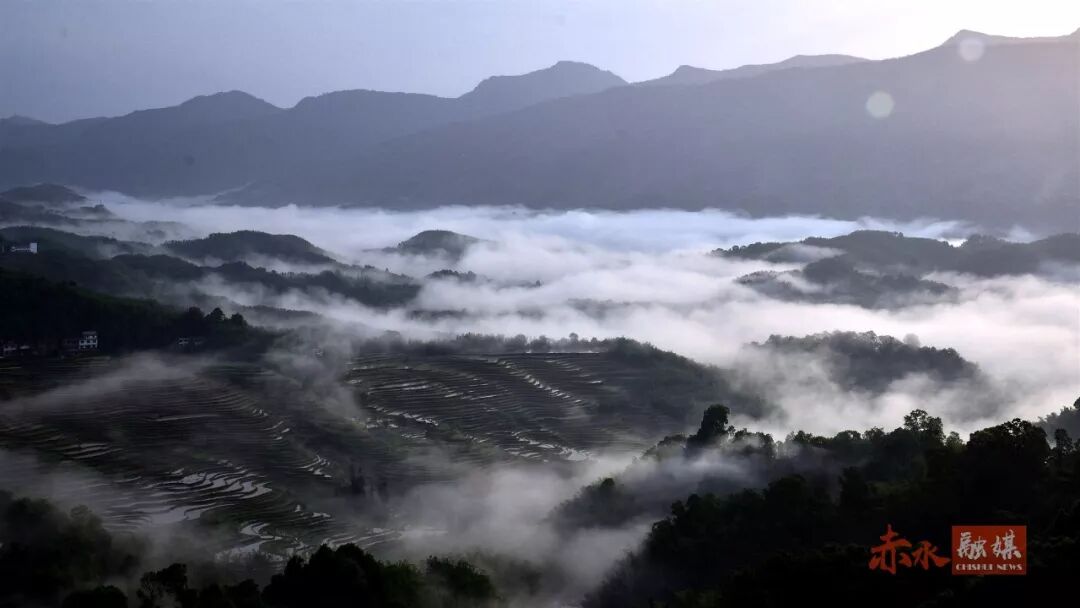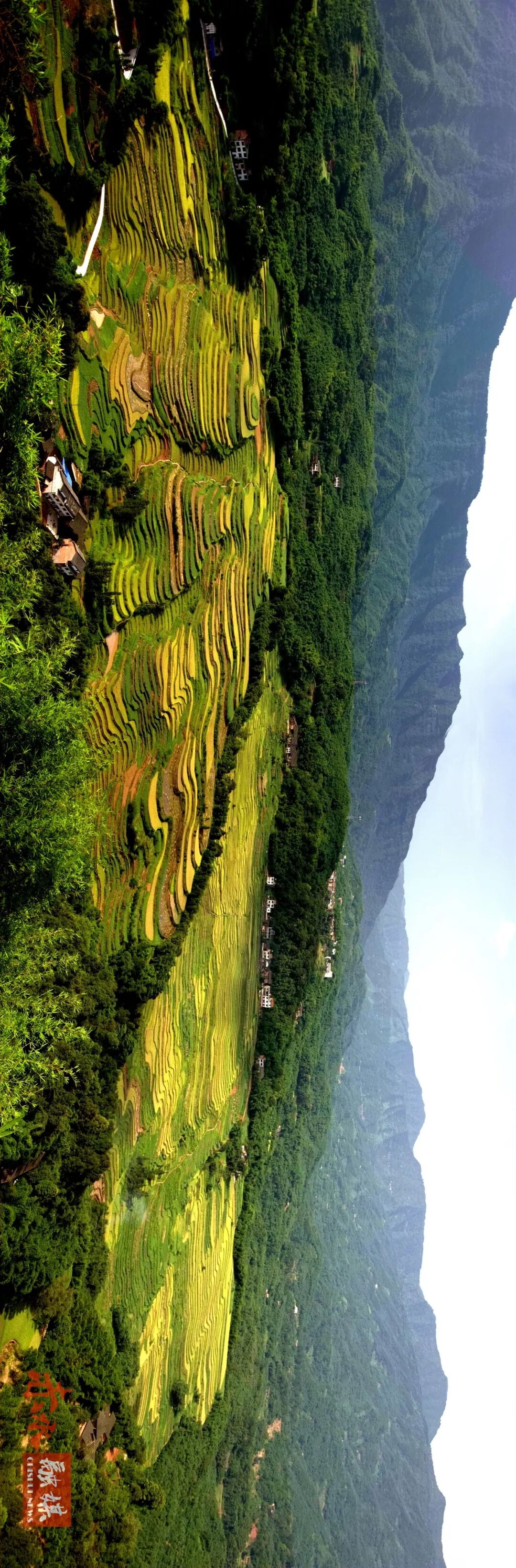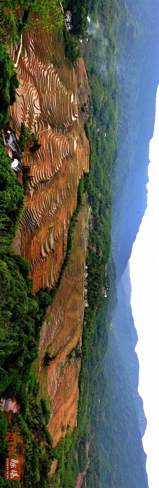 远望梯田叠交错,犹如海上层层波。借得大海万条纹,高山海浪气磅礴。
