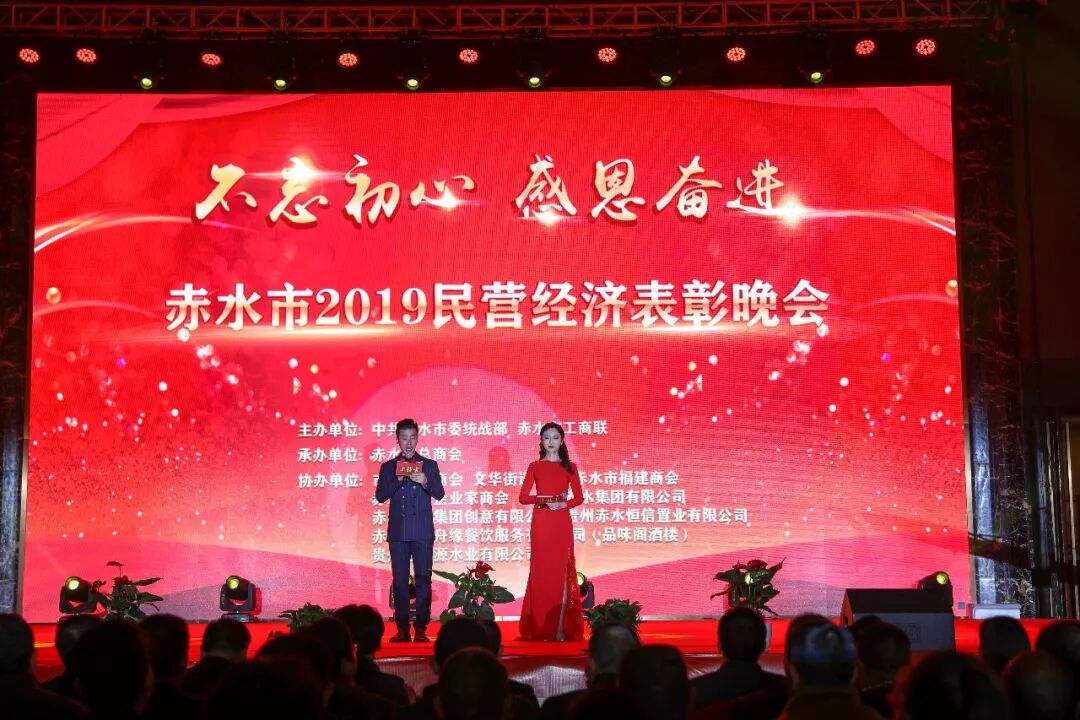 1月4日晚上,“不忘初心 感恩奋进”赤水市2019民营经济表彰晚会举行,晚会由中共赤水市委统战部、赤水市工商联主办,赤水市总商会协办,市委常委、统战部长刘云,市人大常委会副主任穆文卫,副市长郑玉兰,市政协副主席周茂俊出席晚会并颁奖。来自全市各商会、企业以及各乡镇(街道)等500余人参加此次晚会。