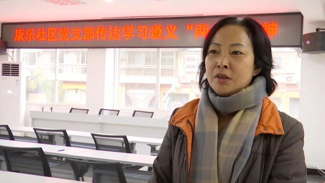 在市中街道康乐社区,刚刚参加完两会的遵义市人大代表毛冬梅正在为群众宣传“两会”精神,将两会政策向社区群众宣传解读。