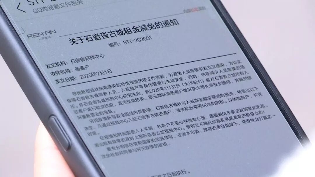 石沓沓古城餐饮经营户李鱼芬说:“这段时间没有正常营业,还挺担心的。今天接到公司通知,从2月1日起给我们减免房租,瞬间感觉轻松很多,希望疫情赶快结束,早日恢复正常营业。”