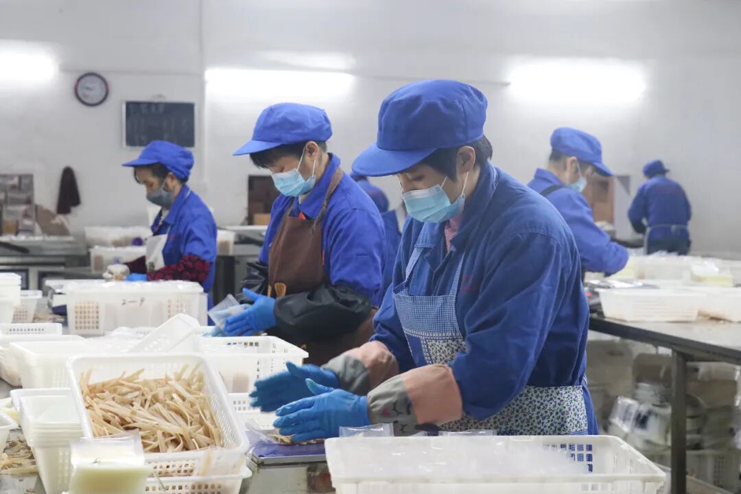 车间里,工人们统一佩戴口罩、手套,在操作台上抢抓生产时间完成粉条包装,及时交付客户订单。