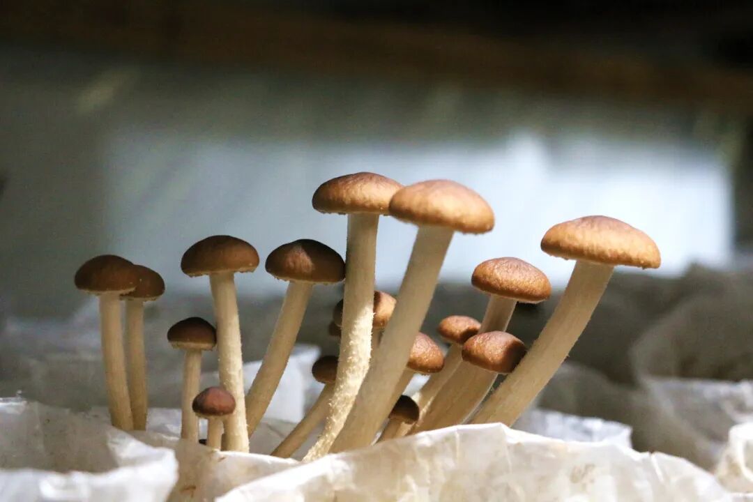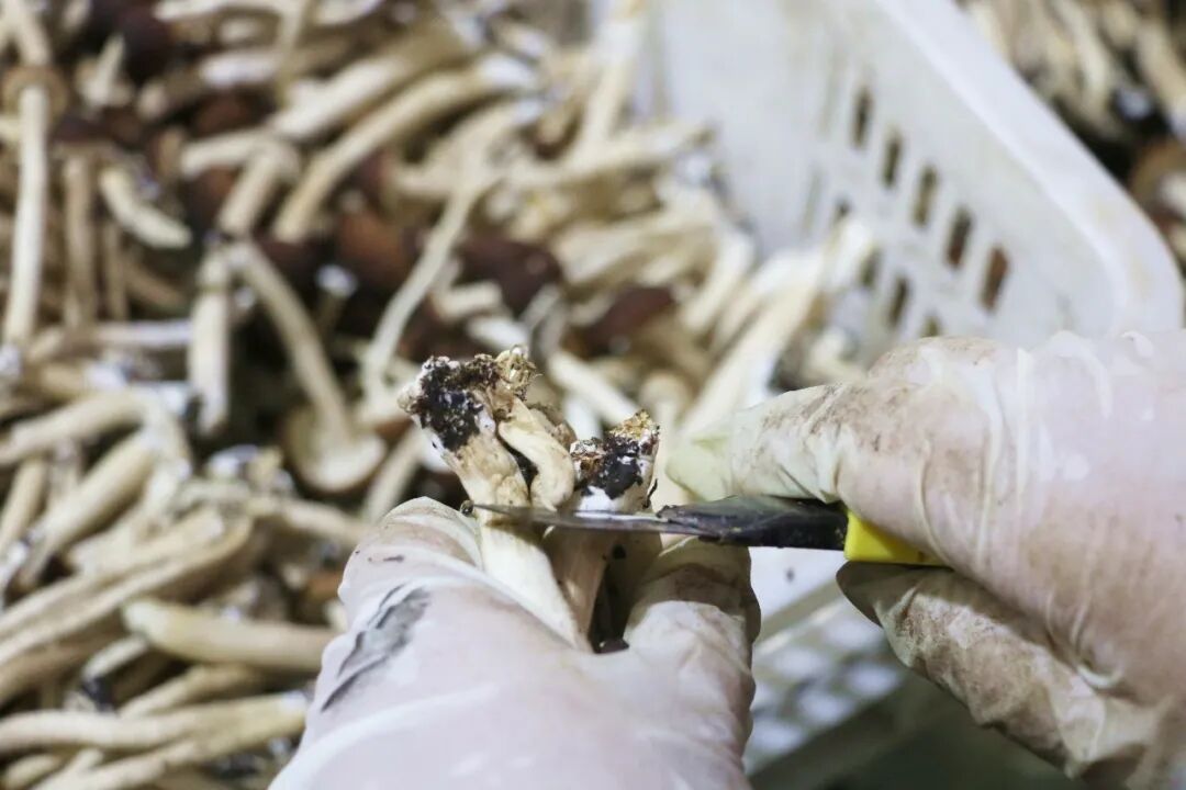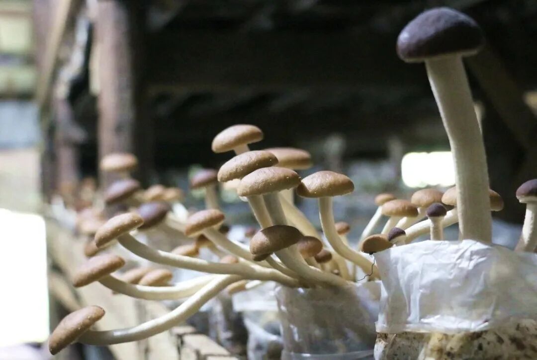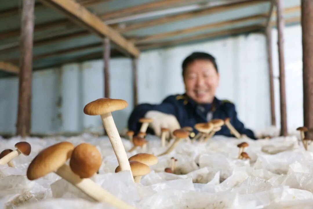 在食用菌温室大棚里,菌棒摆得整整齐齐,一朵朵茶树菇争相“升柄展伞”。