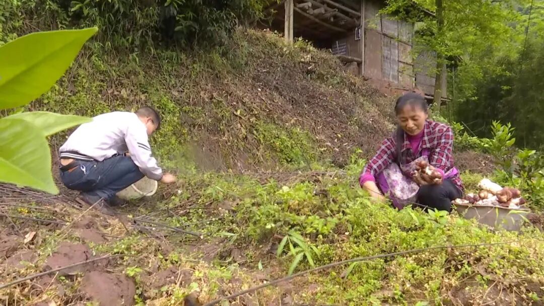 眼下正是赤松茸收获季节。雨过天晴后,一朵朵赤松茸从土里窜出头来,菇体色泽鲜艳,菇棒肥美。在复兴镇复兴村,十多名当地村民正在采摘头一天破土而出的赤松茸。