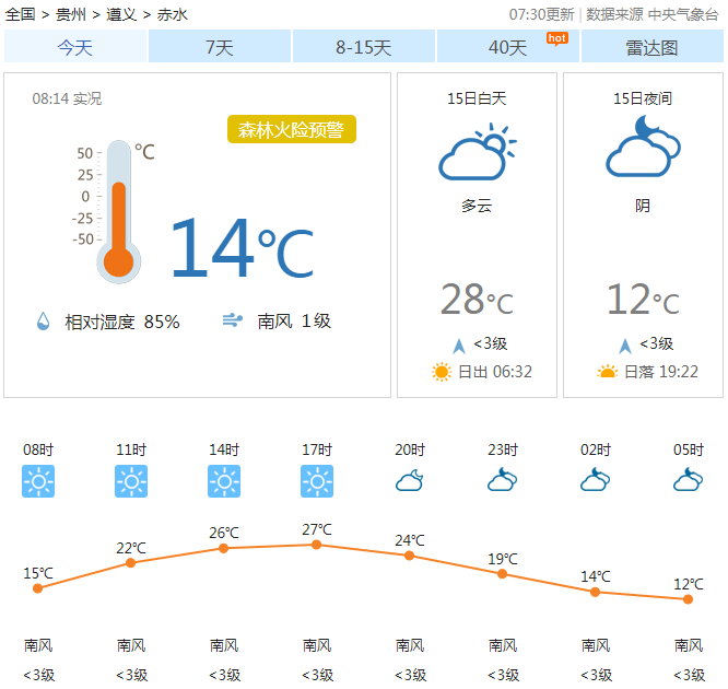 预计今天白天到夜间赤水市各地多云间晴,森林火险气象等级较高,城区气温13~29℃。