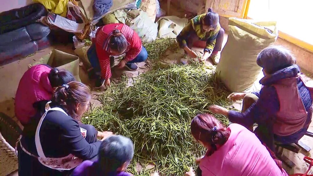 一大早,在赤水市长期镇金钗石斛收购点,村民们正将带来的石斛条进行分拣、打包称秤。