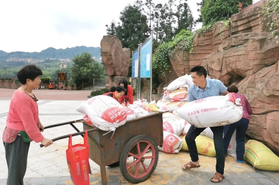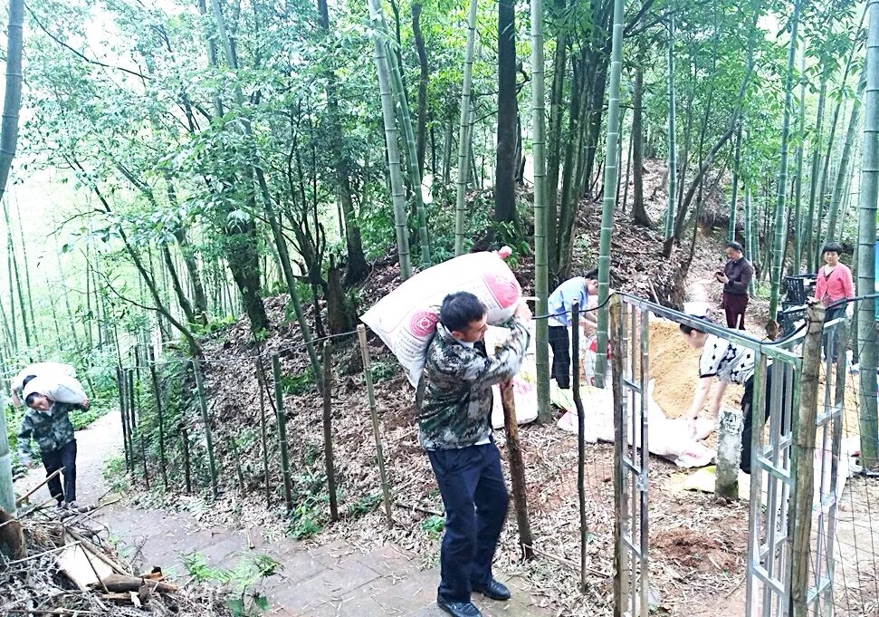 图为社区支部书记杨璐与居民一起搬运种菌锯木面