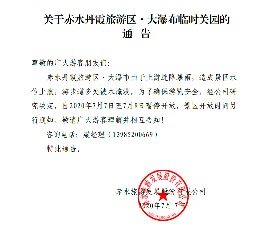 关于赤水丹霞旅游区·大瀑布临时关园的通告
