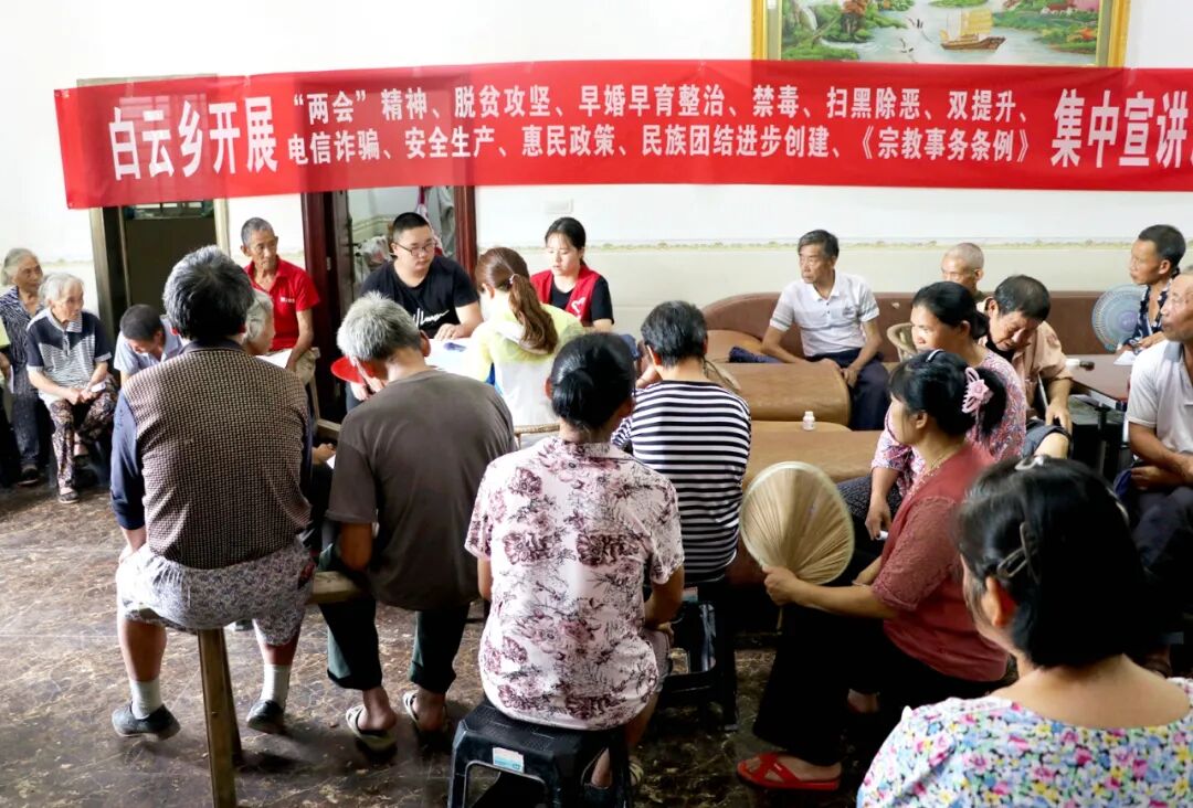 院坝会上,白云乡党员志愿者为村民详细解读了2020年政府工作报告的十大关键词热点内容,并就今年政府工作报告的特点、亮点中的“六稳”“六保”、教育公平、民法典等内容进行了详细的宣讲。