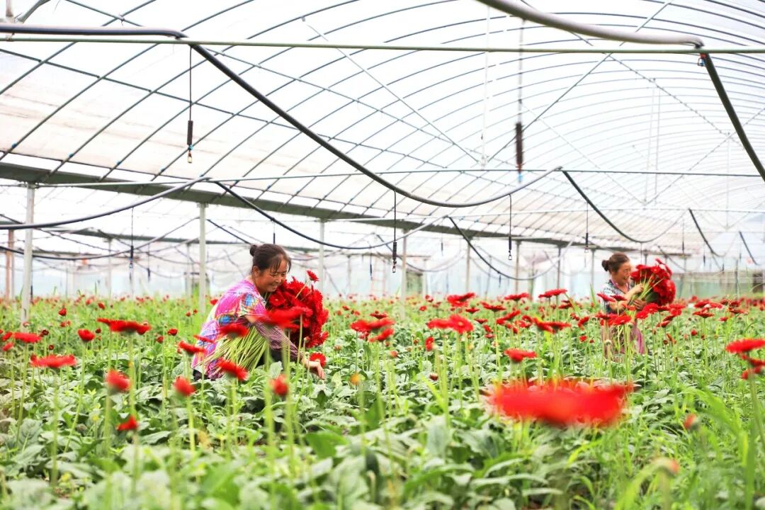 清晨六点,联奉村村民王庆霞就在鲜切花大棚里穿梭,她要和花农们抢抓时机采摘鲜切花。“家门口上班,拿工资还能照顾家,非常方便。”王庆霞是一名熟练工,干起活来得心应手,游刃有余。据基地负责人何文珍介绍,今年曾受疫情影响,鲜切花基地短暂性的销售受阻。近来销量已经回暖上升,市场有需求,每天有很多订单,收入持续增加。近年来,在各级各部门的扶持下,宝源乡党委政府整合优化项目资金,依托引进七彩生态旅游发展有限公司示范带动,以带动农户增收、实现农户有稳定经济收入来源,实行“党支部+龙头企业+农户”运作模式,收益量化给村委会及群众,积极推动企业与农户建立共建共享的机制,做到多个渠道进水、一个池子蓄水、一个龙头出水。鲜切花销售形势令人欣喜,何文珍逐步扩大种植规模,完善硬件设施,进行规范管理,并陆续引进了向日葵、绣球、尤加利等新品种。目前,基地有184个大棚,鲜切花的种植面积达215亩,每亩栽种5500株,亩年产22.5万枝,亩产值为13.5万元。鲜切花的旺销让村民看到了效益,三五邀约来到基地务工,“变身”花农、包装工等,全村剩余劳动力都就业了。如今的联奉村,村民都在家门口当起了上班族,幸福感十足。宝源的鲜切花花型好、花期长、供应充足,渐渐有了名气,吸引商户慕名而来。销售市场也由原来的赤水市城区,扩展到泸州、宜宾、习水、遵义和重庆等地。市场蛋糕越做越大,销售方式也逐渐多元。“非洲菊200支”“组合装100束”……电话、微信、朋友圈,都成了销售的主场,订单一到,村民就在基地采收包装为客户“配货”。每到周末,轻车熟路的商户、慕名而来的游客、采风的摄影爱好者,不约而同来到基地,在花海里畅游、拍摄,或提着篮子,体验采摘,选好中意的花朵,请花农设计包装好,门口扫码支付,就能带走。大家的日子过得红红火火,看着大棚里盛开的鲜切花,何文珍和群众笑得更甜了。(记者:张浪)