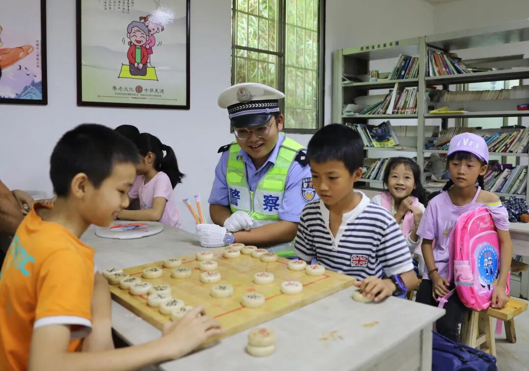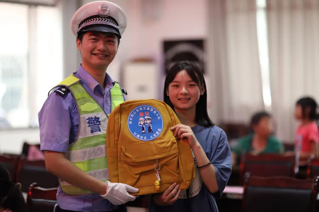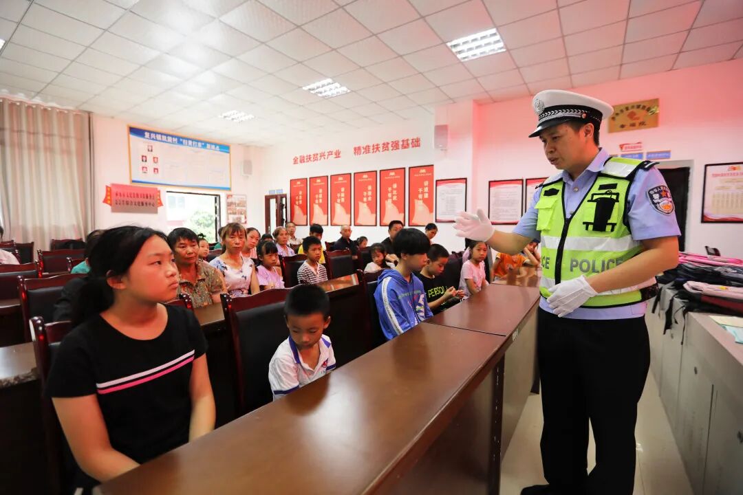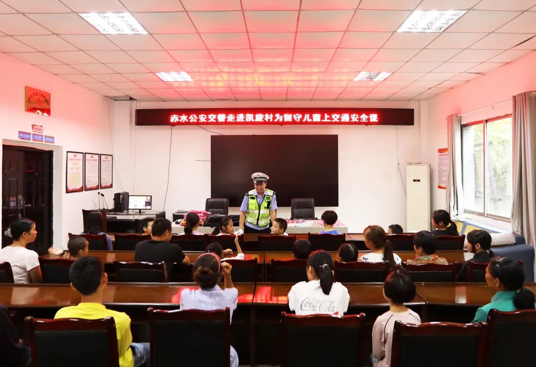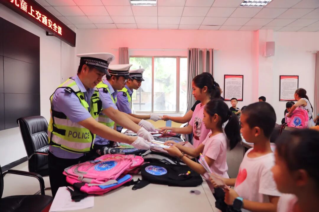 8月13日,正值暑假期间,赤水市公安局交警大队组织民警来到复兴镇凯旋村,为留守儿童讲解道路交通安全知识,赠送印有交通标志的书包、文具盒等学习用品,让孩子们暑假不孤单,安全度假期。