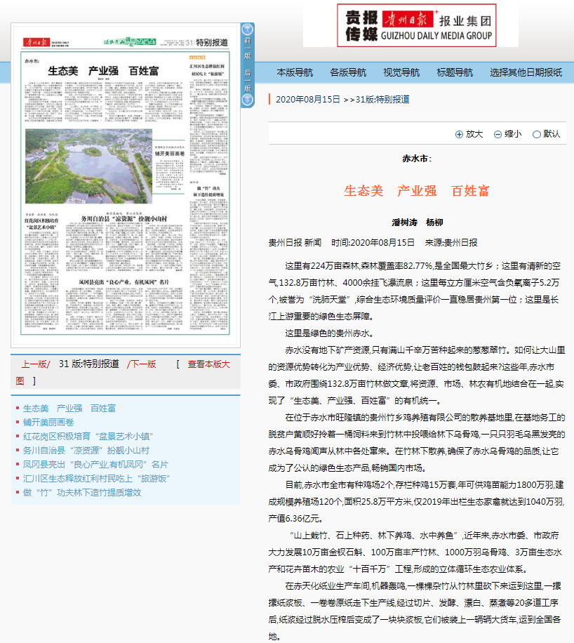 赤水没有地下矿产资源,只有满山千辛万苦种起来的葱葱翠竹。如何让大山里的资源优势转化为产业优势、经济优势,让老百姓的钱包鼓起来?这些年,赤水市委、市政府围绕132.8万亩竹林做文章,将资源、市场、林农有机地结合在一起,实现了“生态美、产业强、百姓富”的有机统一。在位于赤水市旺隆镇的贵州竹乡鸡养殖有限公司的散养基地里,在基地务工的脱贫户黄顺好拎着一桶饲料来到竹林中投喂给林下乌骨鸡,一只只羽毛乌黑发亮的赤水乌骨鸡闻声从林中各处窜来。在竹林下散养,确保了赤水乌骨鸡的品质,让它成为了公认的绿色生态产品,畅销国内市场。目前,赤水市全市有种鸡场2个,存栏种鸡15万套,年可供鸡苗能力1800万羽,建成规模养殖场120个,面积25.8万平方米,仅2019年出栏生态家禽就达到1040万羽,产值6.36亿元。“山上栽竹、石上种药、林下养鸡、水中养鱼”,近年来,赤水市委、市政府大力发展10万亩金钗石斛、100万亩丰产竹林、1000万羽乌骨鸡、3万亩生态水产和花卉苗木的农业“十百千万”工程,形成的立体循环生态农业体系。在赤天化纸业生产车间,机器轰鸣,一棵棵杂竹从竹林里砍下来运到这里,一摞摞纸浆板、一卷卷原纸走下生产线,经过切片、发酵、漂白、蒸煮等20多道工序后,纸浆经过脱水压榨后变成了一块块浆板,它们被装上一辆辆大货车,运到全国各地。