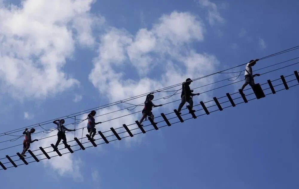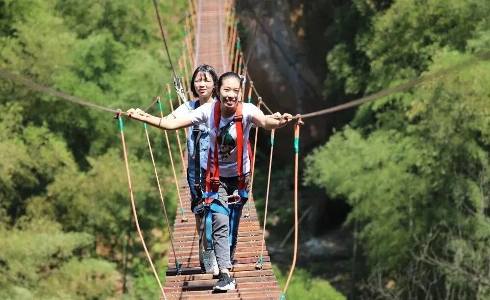 ↑2020年8月30日,游客在贵州省赤水市长沙镇一景区体验“空中云梯”。王长育 摄