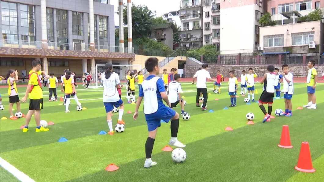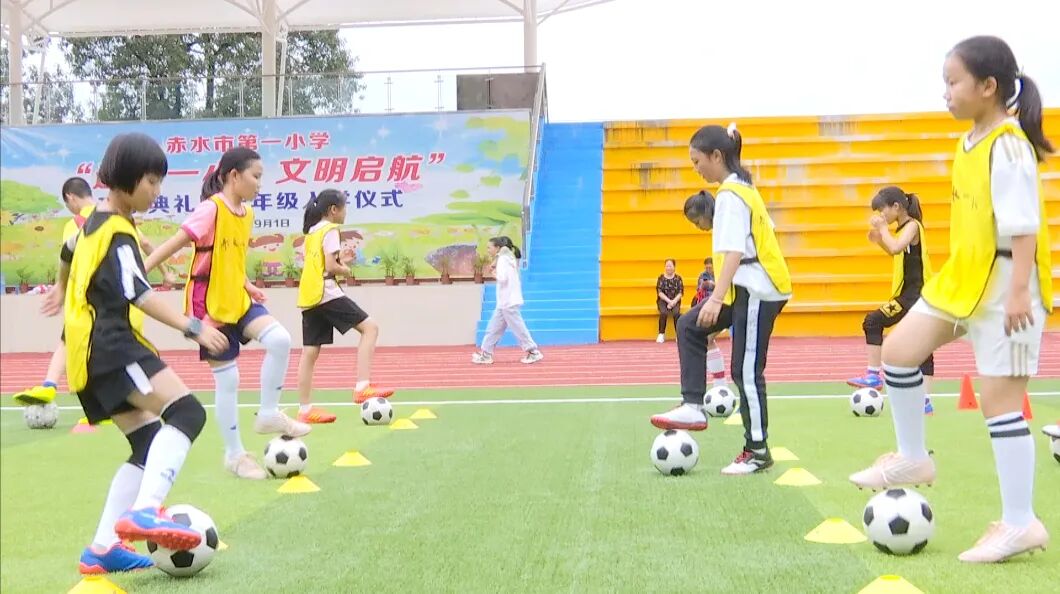 在赤水市第一小学绿茵场上,足球教练正在对社团的学生进行系统训练,根据学生的年龄组织学生学习运球、传球、颠球、带球、顶球、射门等基本技能。