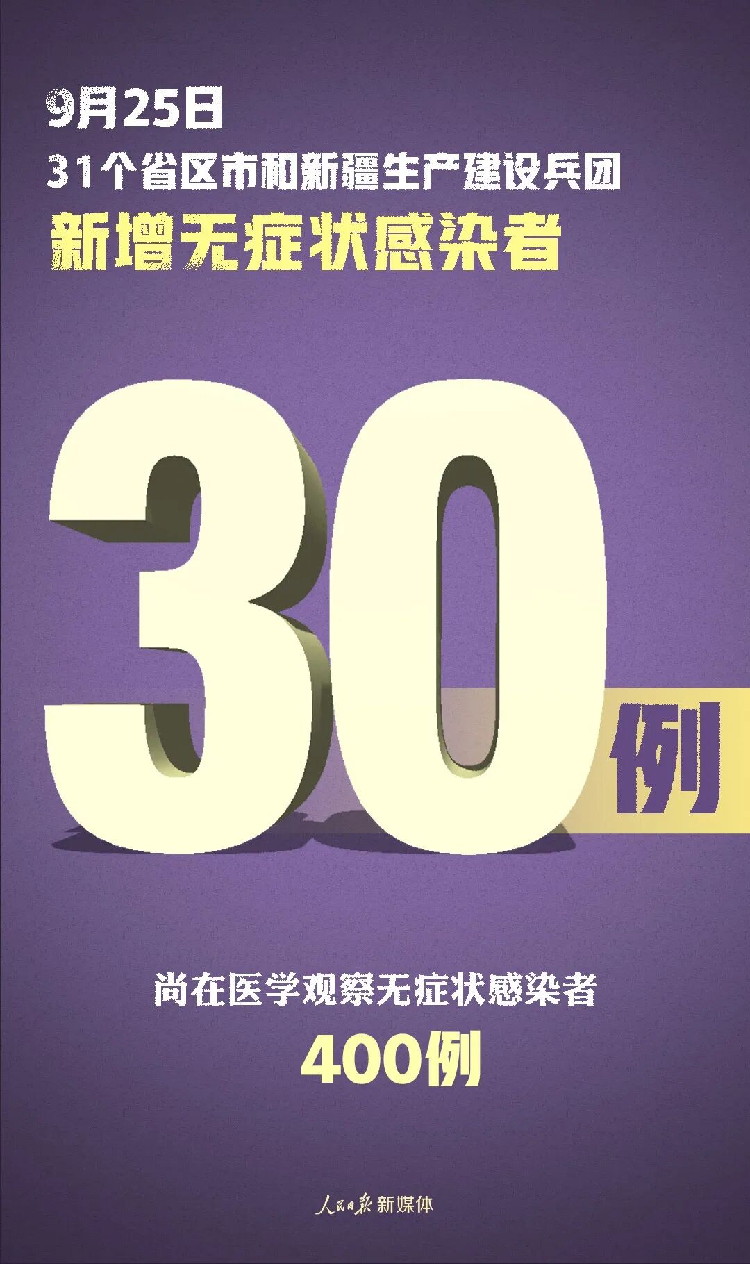 当日新增治愈出院病例14例,解除医学观察的密切接触者608人,重症病例与前一日持平。境外输入现有确诊病例167例(其中重症病例3例),现有疑似病例2例。累计确诊病例2788例,累计治愈出院病例2621例,无死亡病例。截至9月25日24时,据31个省(自治区、直辖市)和新疆生产建设兵团报告,现有确诊病例167例(其中重症病例3例),累计治愈出院病例80536例,累计死亡病例4634例,累计报告确诊病例85337例,现有疑似病例2例。累计追踪到密切接触者830088人,尚在医学观察的密切接触者7085人。31个省(自治区、直辖市)和新疆生产建设兵团报告新增无症状感染者30例(均为境外输入);当日无转为确诊病例;当日解除医学观察28例(均为境外输入);尚在医学观察无症状感染者400例(境外输入398例)。