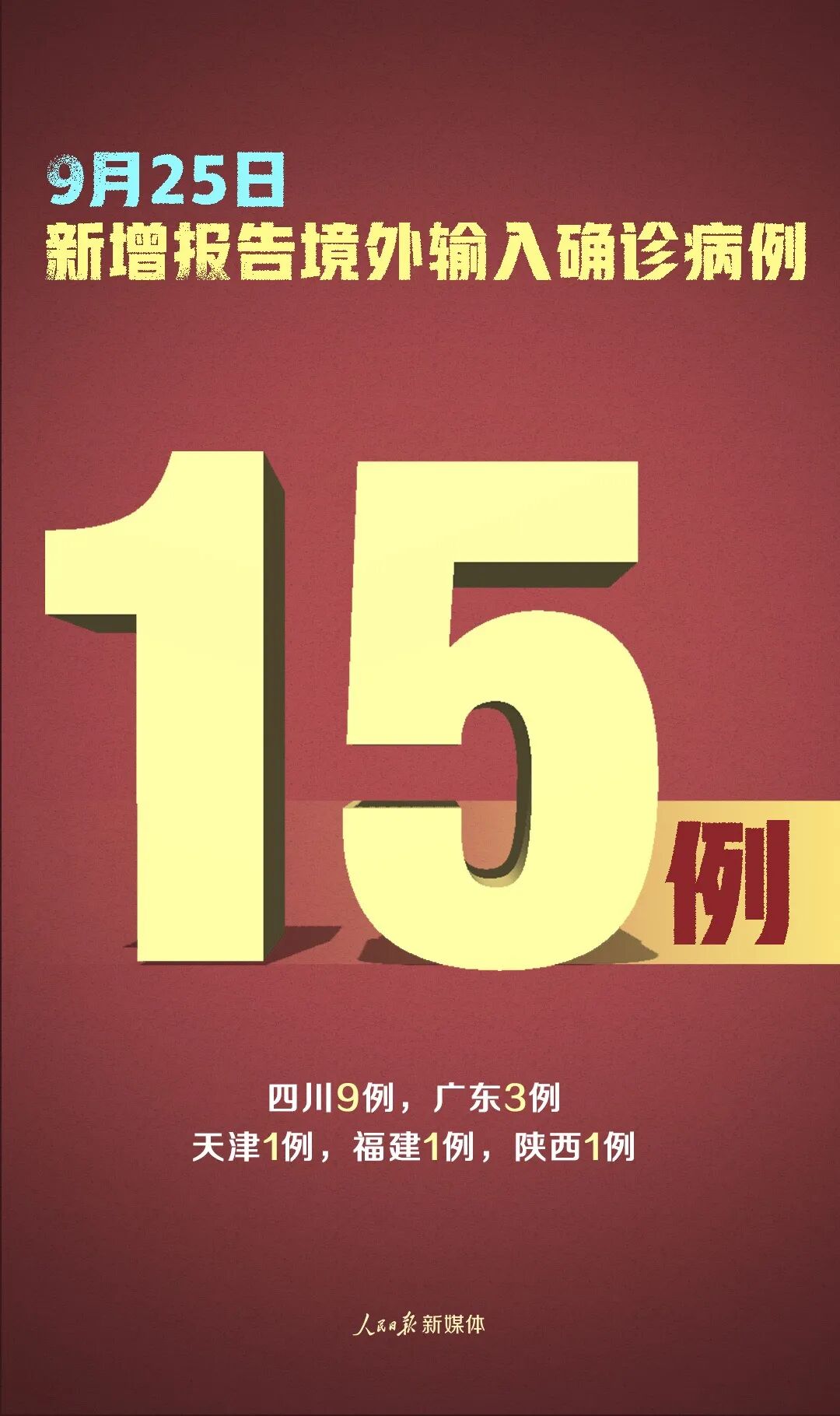 9月25日0—24时,31个省(自治区、直辖市)和新疆生产建设兵团报告新增确诊病例15例,均为境外输入病例(四川9例,广东3例,天津1例,福建1例,陕西1例);无新增死亡病例;新增疑似病例1例,为境外输入病例(在上海)。