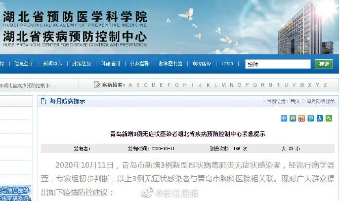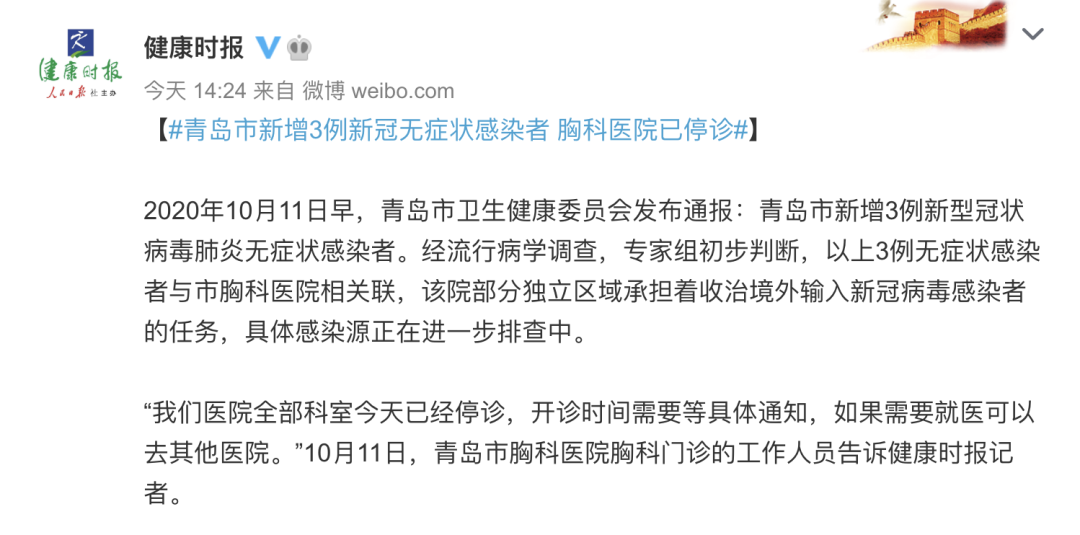 近期,青岛市发生聚集性反弹疫情,截至10月11日23时,青岛市共发现新冠肺炎确诊病例6例、无症状感染者6例,均与青岛市胸科医院高度关联。 青岛市反弹疫情再次警示我们新冠肺炎疫情防控的复杂性和不确定性。由于国庆中秋长假期间人群跨省流动频繁,为严格落实“外防输入、内防反弹”各项常态化防控策略,保障广大人民群众生命健康安全,省卫生健康委特别提醒广大群众: 一、9月29日以来有青岛市旅居史及与确诊病例或无症状感染者行动轨迹有交集的人员,需立即主动到所在社区报备,按照当地社会防控部门的要求,接受社区健康管理并进行核酸检测。同时,要密切观察个人健康状况,一旦出现发热、咳嗽等不适症状,须立即佩戴口罩,尽量避免乘坐公共交通工具,并立即到就近发热门诊或定点医疗机构就诊,并如实告知个人旅居史、活动史和接触史。 二、即日起,从青岛市中高风险地区返黔人员需提供7日内核酸检测证明,如无法提供核酸检测阴性证明的,应立即接受核酸检测或14天隔离医学观察。广大群众如非必要,近期不要前往青岛市;如必须前往,请务必全程做好个人防护。 三、广大群众需继续加强个人防护意识,养成科学佩戴口罩、勤洗手、常通风、保持安全社交距离的卫生习惯,坚持不扎堆、不聚会、常锻炼的良好生活习惯。 据山东省青岛市卫生健康委员会网站12日消息,截至10月11日23时,青岛市共发现6例确诊病例,其中2例为此前发布的无症状感染者江某某(女)、韩某某转归;6例无症状感染者。到目前发现的所有确诊病例和无症状感染者均与市胸科医院高度关联。 青岛新增核酸检测结果阳性9人 其中4例为确诊病例 11日,青岛市发现3例新冠肺炎无症状感染者后,立即组织开展大规模的流调排查和分类检测,将密切接触者和市胸科医院相关人员作为高风险人群进行重点监测。共排查到密切接触者和市胸科医院所有在院患者及陪护人员377人,其中新增核酸检测结果阳性9人,包括8名市胸科医院在院患者及陪护人员、1名患者家属,经专家组判定,其中4例为确诊病例、5例为无症状感染者。 青岛开展大规模流调排查和分类检测 5天内对全市检测全覆盖 已排查密切接触者的密切接触者76人,已出结果34人,均为阴性;一般接触者810人,已出结果485人,均为阴性。排查全市医疗机构工作人员、新住院患者和陪护人员143893人,全部完成采样,已出结果114862人,全部为阴性。制定并已启动全员检测方案,在广大市民的积极配合下,社区检测正在加快推进,3天内对市南、市北、李沧、崂山、城阳五区检测全覆盖,5天内对全市检测全覆盖,检测结果将及时发布。 △11日晚,青岛不少社区通知小区居民进行免费核酸检测,部分市民夜间排队等待做检测。 11日上午,山东省委统筹疫情防控和经济运行工作指挥部召开会议,明确:要加强对所涉医院和居住小区的管控,抓好重点人群管理,坚决切断传染途径;要立即开展大规模核酸检测,全面彻底排查可能的感染者,务必做到从多从快,尽快实现城区人员检测全覆盖。 青岛市胸科医院已停诊 医生称未出现院内感染 据健康时报报道,10月11日,青岛市胸科医院胸科门诊的工作人员表示,医院全部科室今天已经停诊。工作人员表示,该医院是收治新冠肺炎的定点医院,现在还有新冠肺炎患者在院,但是确诊患者的住院区域与其他住院患者是分开的。 该院胸三科一孙姓医生认为,不用太恐慌,目前虽然停诊,但医生都在坚守岗位,医院内也在配合调查,目前没有出现院内感染的情况。三个无症状感染者如何感染,我们也不清楚。 青岛市市北区洛阳路街道办事处工作人员告诉记者,“现在出现确诊病例单元已封闭,但小区没有封,建议现在最好不要过去那边,我们正在紧急处理中。” 多地紧急提醒: “如非必要,近期不要前往青岛” 11日上午,青岛市发布新增3例新冠病毒无症状感染者的消息之后,国内多地相继发布提醒:“如非必要,近期不要前往青岛市”。 例如,在山东省内,菏泽市牡丹区政府官网发布了《关于做好近期新冠肺炎疫情防控的紧急通告》,紧急排查9月27日以来到过青岛市胸科医院、接触过医院病人、与青岛新增确诊患者和无症状感染者行程轨迹有交集、接触过近期从青岛市入境人员以及青岛市市北区的居民。 同时,菏泽市牡丹区提醒市民:如非必要,近期不要前往青岛市。如必须前往,请务必做好个人防护,准确记录好自己的活动轨迹;从青岛市返回后,要按照我区的相关政策执行。 与山东一海之隔的东北多地也发布通知,提醒居民关注青岛疫情,其中包括但不限于辽宁省的大连市、丹东市,吉林省的白城市、桦甸市、公主岭市。 不止北方城市,如江西省赣州市等南方部分城市也发布了提示信息,提醒市民关注青岛疫情状况。 此外,湖北疾控中心也发布紧急提示:9月27日以来自青岛返鄂人员应主动报备,并做核酸检测。