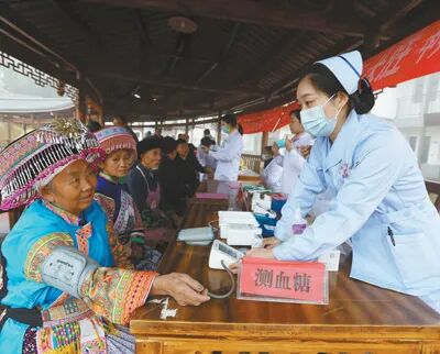 近日,在贵州省赤水市元厚镇石梅村易地扶贫搬迁安置点,赤水市中医院开展健康扶贫行动,医院医护人员给苗族群众测血糖、量血压,进行健康指导等。王长育摄