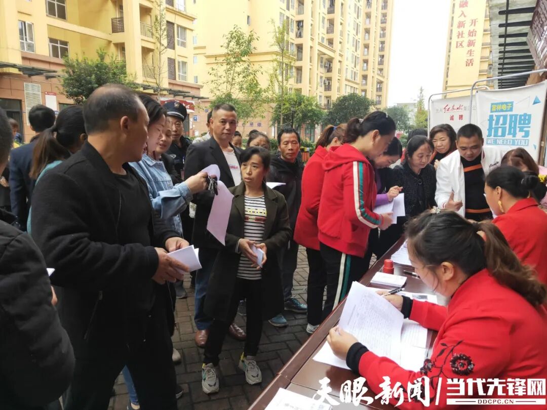 当天的专场招聘现场共有来自赤水市内涉及电子、食品、日化等多个行业的12家企业提供了1000余个就业岗位,类型涵盖管理岗位、专业技术岗位、普通工人岗位。天台镇天苑社区党支部在招聘会前先通过社区微信工作群、社区村务公开栏、点对点联络、就业帮扶志愿服务队入户等形式,多渠道宣传招聘信息,确保搬迁群众户户知晓。在招聘会当天没有找到满意岗位的群众,工作人员还详细登记就业群众的就业需求,为下一步举办招聘活动及开展就业指导和技能培训提供参考。