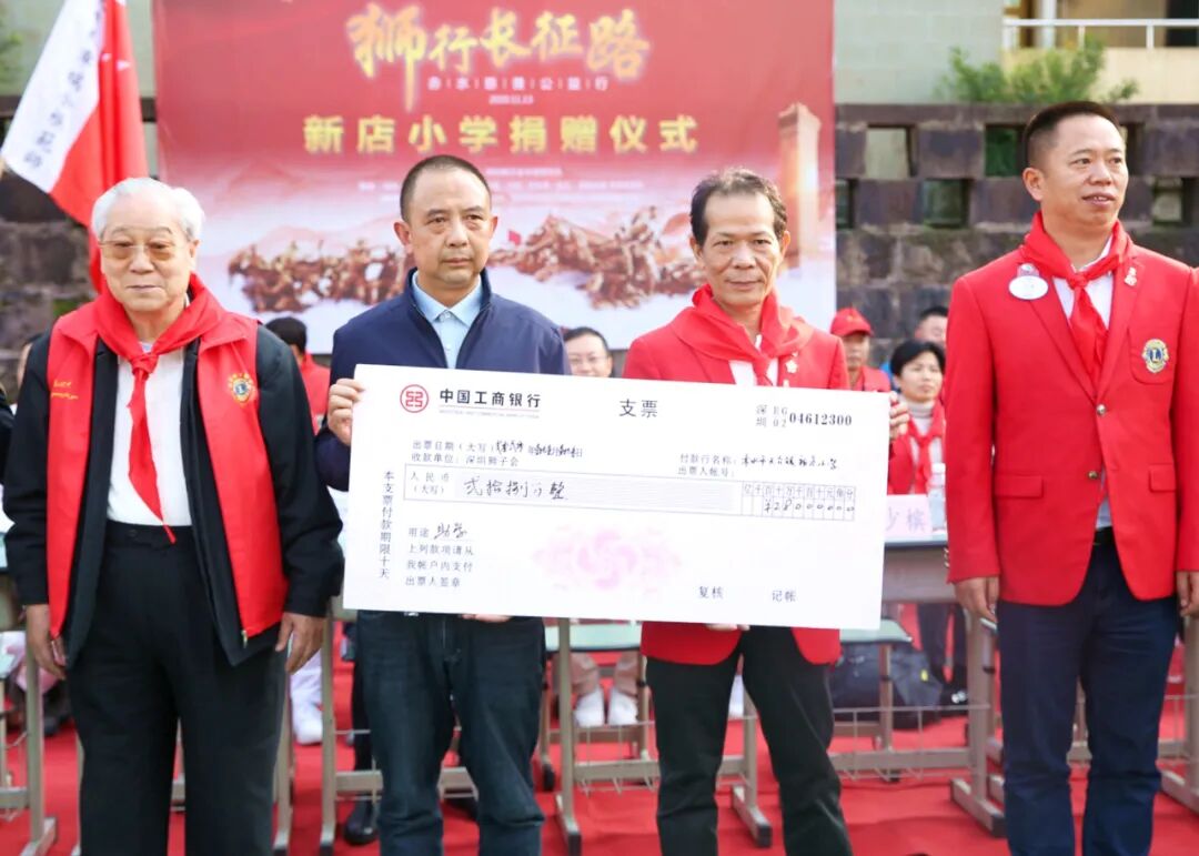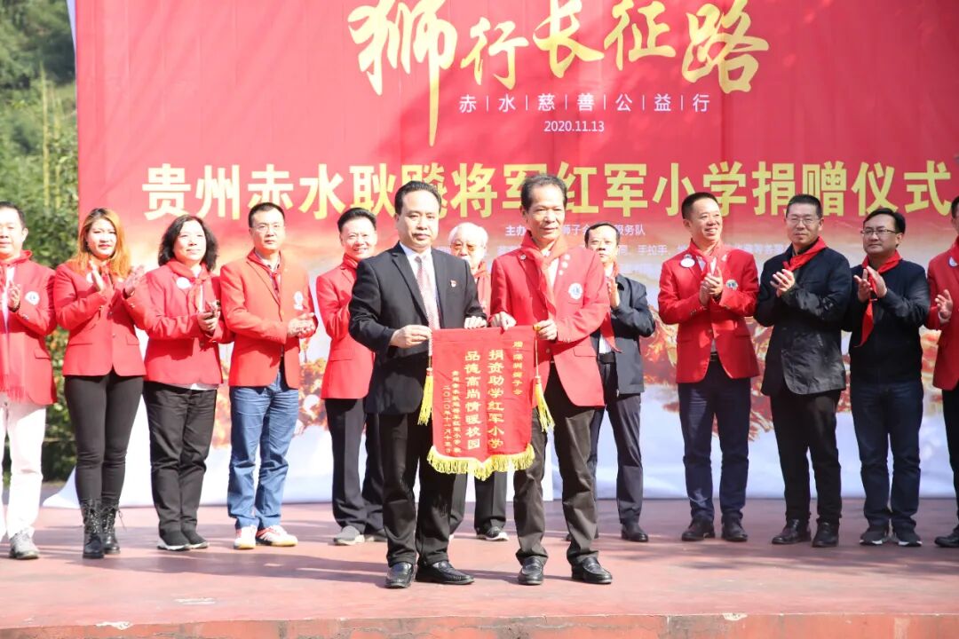 活动中,学生代表为爱心人士献上红领巾。深圳狮子会华商服务队分别向丙安红军小学、新店小学、赤水市社会福利院赠送了学习用品和生活用品,授“‘狮行长征路’遵义慈善公益行”共建单位牌匾,并收到回赠锦旗。爱心人士希望学生们能够努力学习,用知识武装自己,以最好的成绩回报家乡、回报社会。
