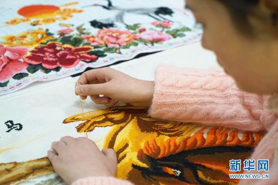 ↑ 11月22日,在赤水市长期镇康桥社区,一名女青年在扶贫车间刺绣。新华社发(张鹏 摄)