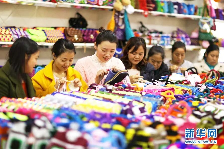 ↑ 11月22日,在赤水市长期镇康桥社区,当地群众在扶贫车间钩织产品。新华社发(王长育 摄)