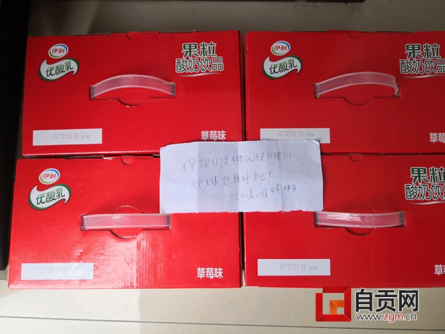 “不管你们是本地的还是外地的,火灾无情,照顾好自己!一点心意,请不要嫌弃。”4月4日上午11时40分左右,一位热心的市民将四箱草莓味酸奶悄悄地放在荣县大队二佛街中队门口,悄悄离开。
