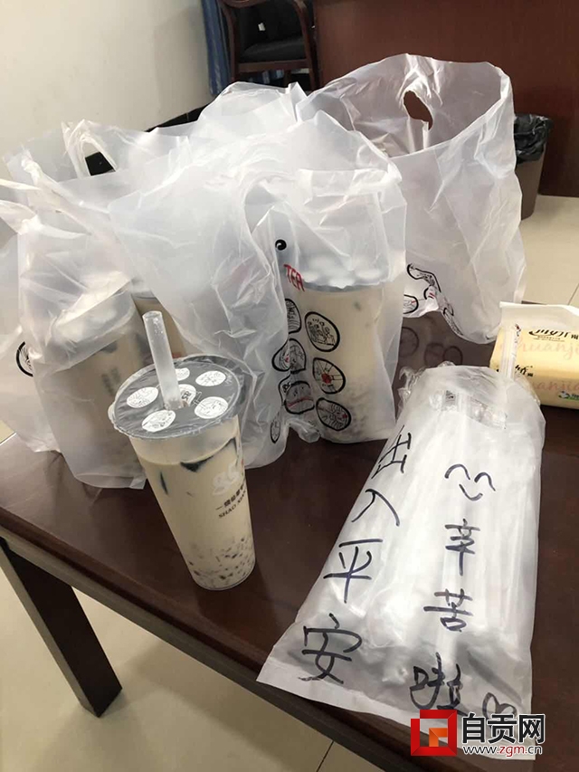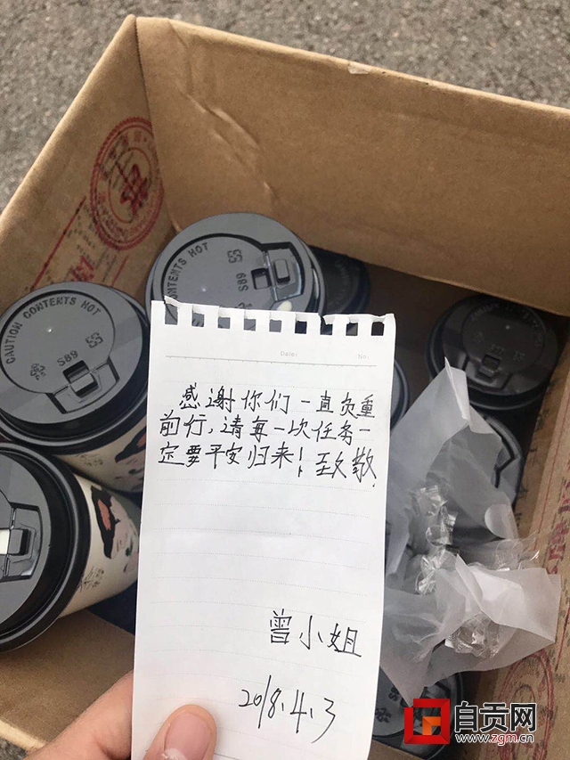 逆行道路,并不孤单。最早给消防员们送温暖的事件发生在3日上午。当天,一位自贡市民通过外卖小哥给富顺大队东湖路中队送来二十杯奶茶,并附上了一张字条,“感谢你们一直负重前行,请每一次任务一定要平安归来!致敬!”落款为曾小姐,时间却被快递小哥哥不小心写作了2018年4月3日。消防员们在收到“礼物”后很是感动,通过抖音平台发送小视频表达了感谢,“曾小姐,感谢你匿名给消防员送上奶茶,我们中队的所有人员都非常感谢你!奶茶很甜,也很暖!愿你也被生活温柔以待。顺便,外卖小哥,你把日期是不是搞错了!”