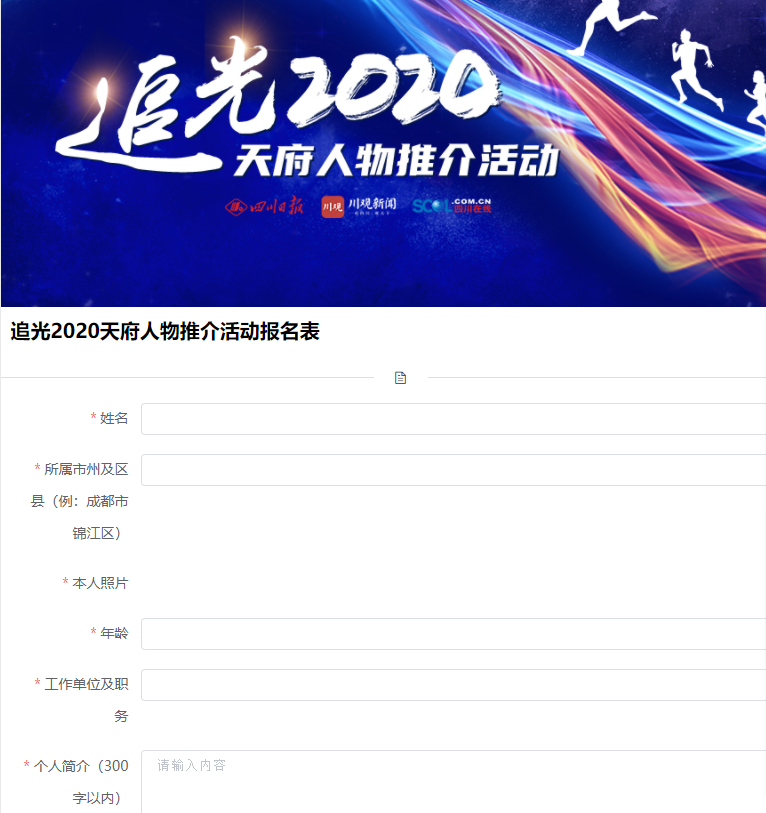 无论是在2020年引起社会广泛关注的正能量人物,还是为推动社会进步作出杰出贡献的先进人物,或是在各行各业具有杰出贡献或重大表现的领军人物,以及我们身边令人感动的普通人,都有可能成为“追光2020”天府人物候选人。候选人通过自荐与推荐相结合的方式产生,全省183个县级融媒体中心将积极推荐候选人,本人也可经所在单位或所在地的居委会、村委会等确认后,进行自荐。推荐报名可登录川观新闻客户端,在首页点击“天府人物”报名通道,按要求填写信息并上传、发送相关资料。详情咨询热线:17761230324。
