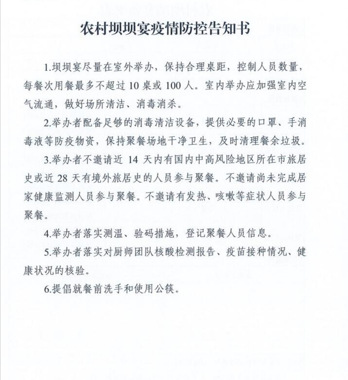 常态化疫情防控期间,农村坝坝宴按规模大小实行分级指导,总人数规模控制在100人以内(包括流水席规模)。