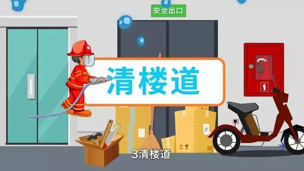 清楼道:切勿在走道、楼梯拐角、地下室等处堆放杂物;电动车不应在楼梯间、疏散通道、安全出口处充电,充电时不得时间过长,且周围不得有可燃物。应保持消防通道、安全出口、疏散通道畅通,不在电缆井和电梯井内堆放杂物。