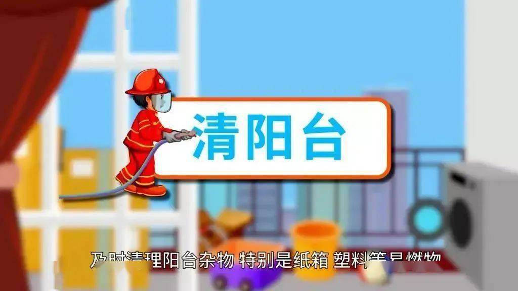 清阳台:要及时清理阳台上的杂物,特别是纸箱、纸皮、塑料等易燃物。长时间外出,要关闭门窗,以免火星飞入家中引起火灾。