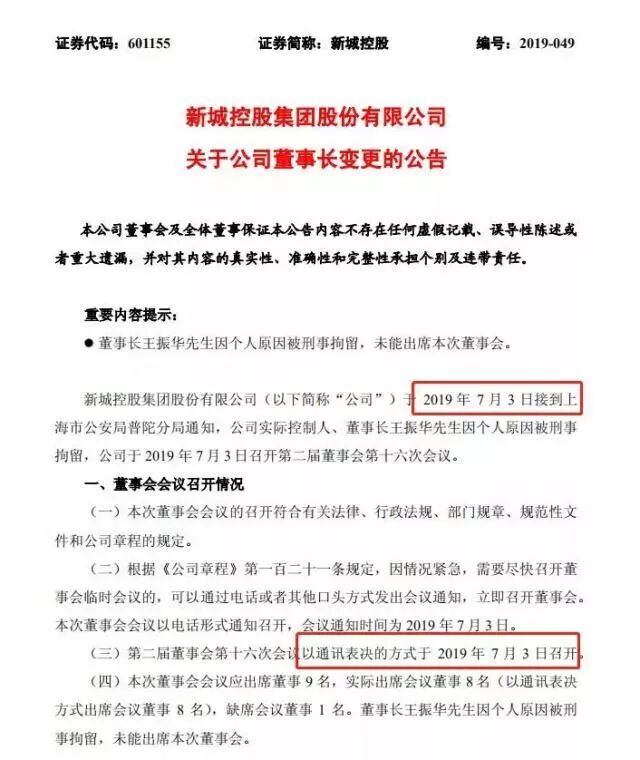 警方发布通报当晚,上市公司新城控股发布董事长变更公告,称因原董事长王振华因“个人原因”被刑事拘留,公司召开临时董事会选举公司董事兼总裁王晓松任董事长。王晓松是王振华之子。受这一消息影响,新城控股的股价昨天(4日)开盘一路大跌,蒸发96亿市值。此外,据报道,新城控股官网上已删除与王振华有关的新闻图片。