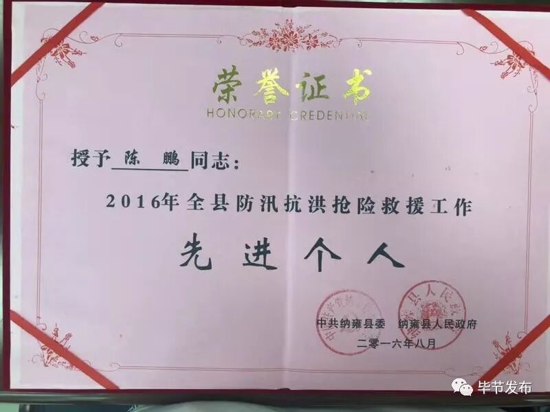 △ 2016年,陈鹏在纳雍县防汛抗洪抢险救援工作中获先进个人奖励