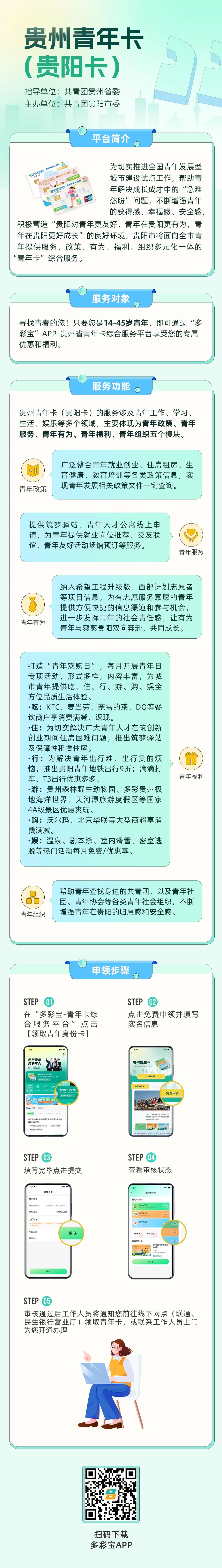 “贵州青年卡(贵阳卡)”综合服务平台由共青团贵州省委指导、共青团贵阳市委主办,依托全省政务服务移动端“多彩宝”APP建设运营,为14—45周岁学习、生活、工作在贵阳的青年提供线上与线下融合、政府与市场结合的一体化综合服务,切实满足青年对吃住行、娱购游、就业、健康、金融等领域的多样化需求。