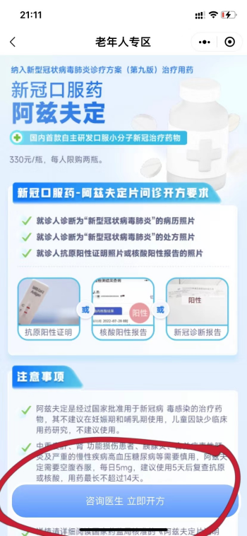 线上购药详细流程图 第一步:微信搜索“贵阳市互联网健康服务平台”。 第二步:点击“老年人专区”。 第三步:点击“咨询医生 立即开方” 第四步:选择医生,点击“图文咨询”。 第五步:点击“确定”。 由于阿兹夫定是处方药,需要医生在线开药方方可购买。对于开方要求,需要提供就诊人诊断为“新冠肺炎”的病例照片、处方照片,或就诊人抗原、核酸阳性证明照片。按照以上要求,至少需要提供一项新冠确诊证明方可开药。 据介绍,阿兹夫定为广谱RNA病毒抑制剂,可抑制新冠病毒聚合酶,阻断复制。主要用于治疗普通型成年新冠肺炎患者,一天一次,一次5片,一盒35片,吃7天。空腹服用,不可咀嚼。18岁以下青少年、孕妇、哺乳期、肝肾功能不全、中重度肝损伤慎用。 贵阳市卫生健康局提醒:阿兹夫定为处方药,主要是为了给高龄老人和其他有严重基础疾病风险的脆弱人群备用,应遵循治疗指南服用,没必要囤药。